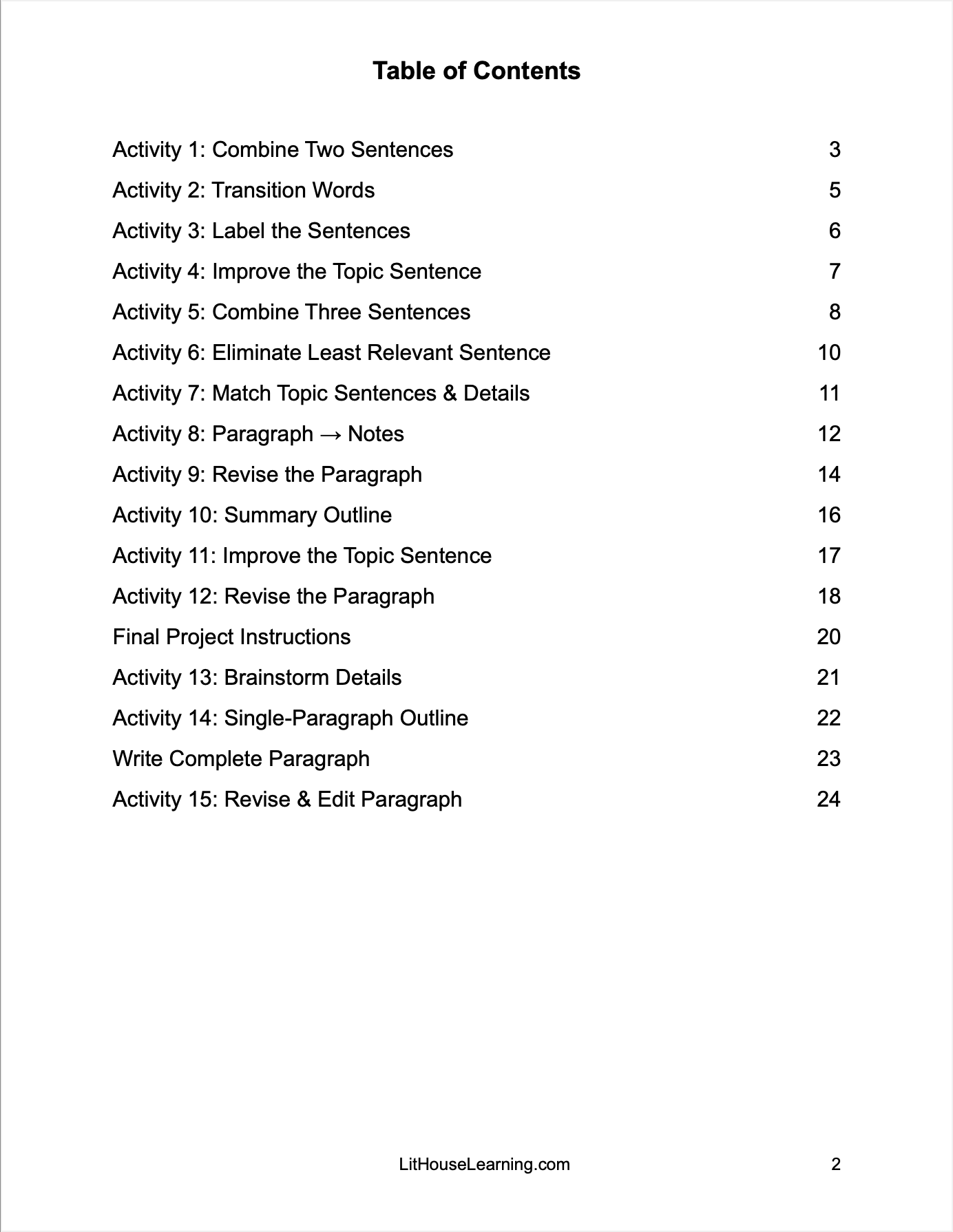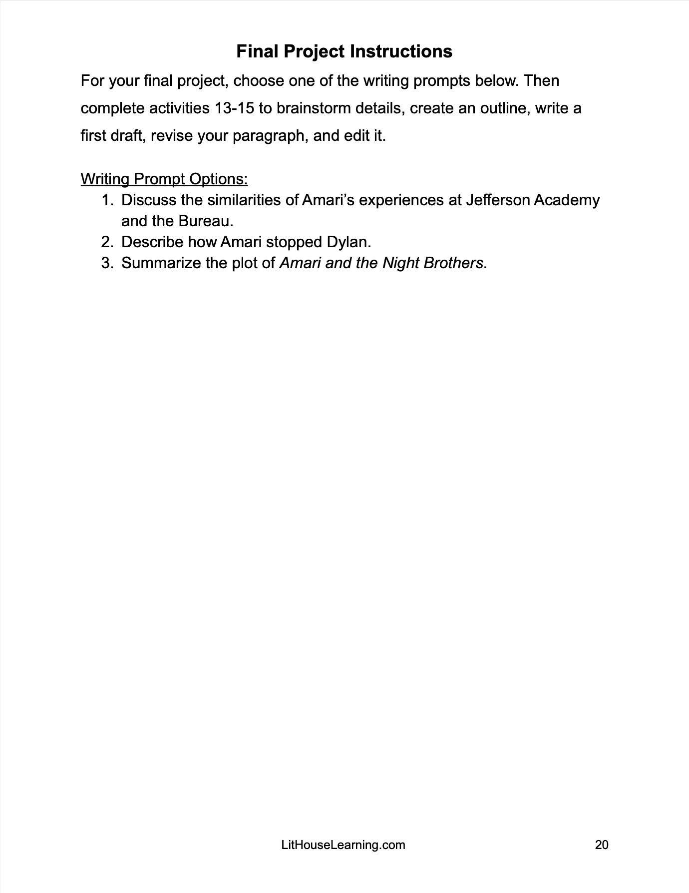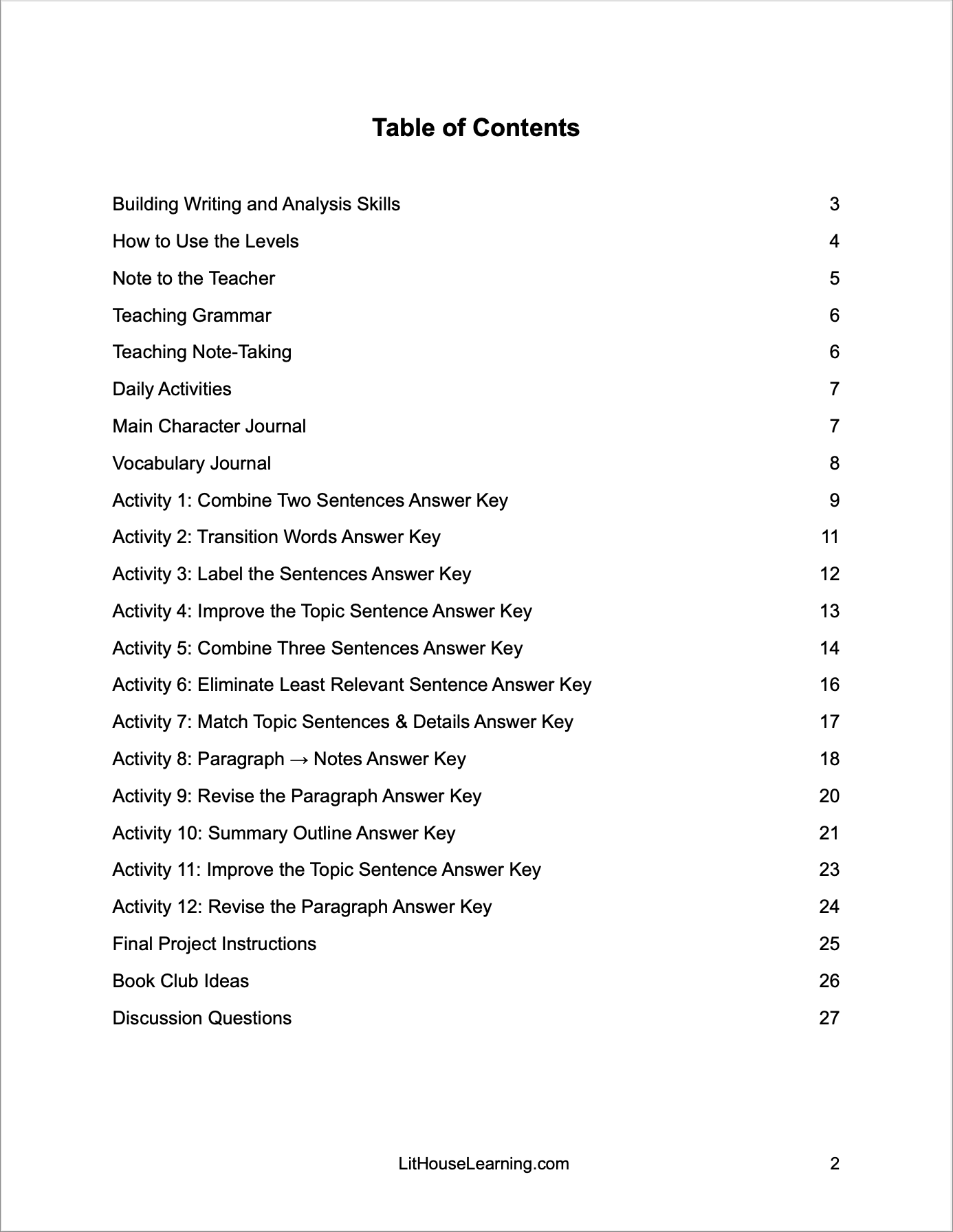 For 12 days, your learner will read, take notes, complete sentence and paragraph-level writing activities, and study vocabulary. On day 13, your student will select the prompt for their final project paragraph and brainstorm details for it. On day 14, you will discuss the note-taking project with your learner, and they will also outline and draft a paragraph. On day 15, they will revise and edit their paragraph to produce a polished final draft. On day 16, you can have a themed book club with further discussion questions, snacks, and activities.