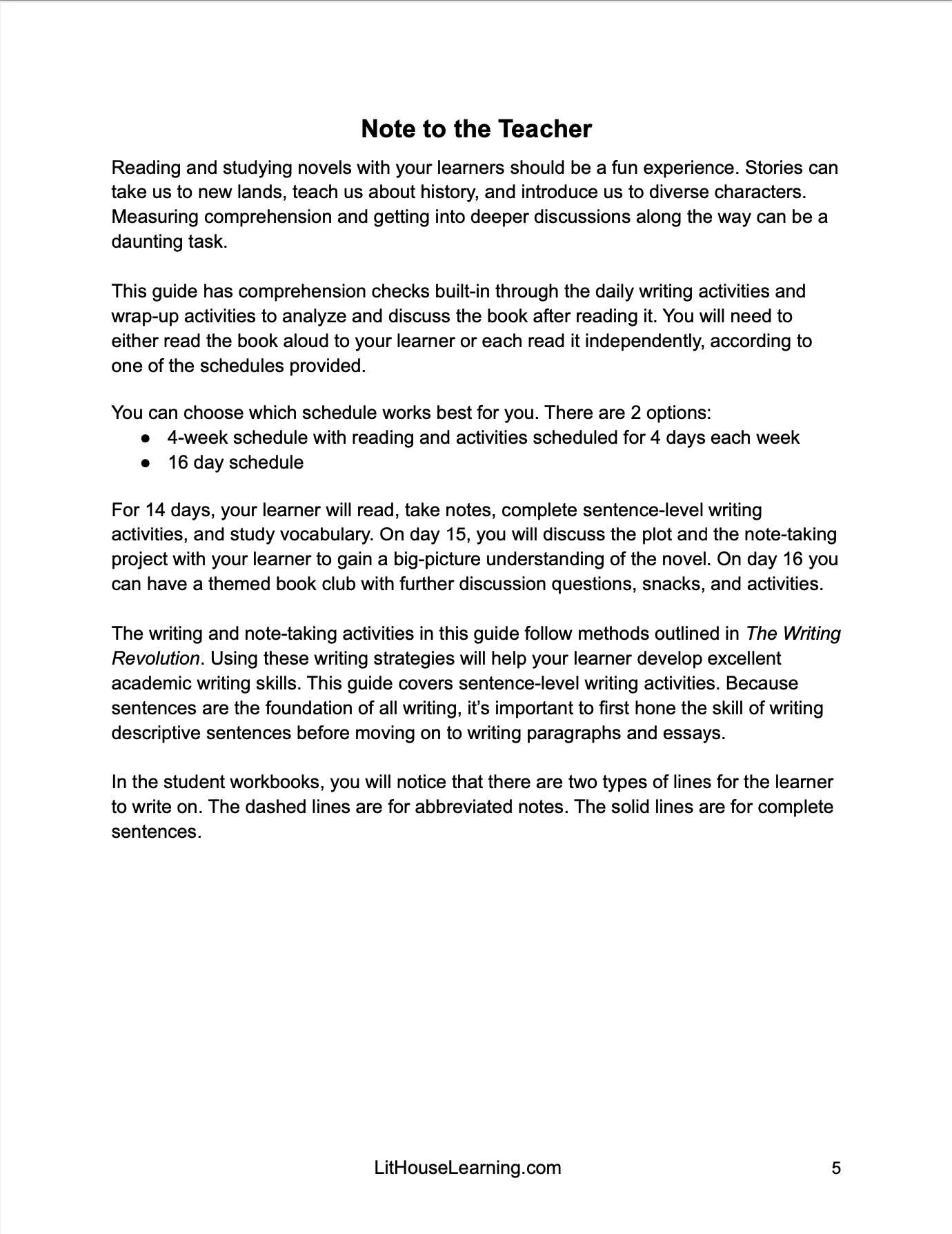 For 14 days, your learner will read, take notes, complete sentence-level writing activities, and study vocabulary. On day 15, you will discuss the plot and the note-taking project with your learner to gain a big-picture understanding of the novel. On day 16 you can have a themed book club with further discussion questions, snacks, and activities.