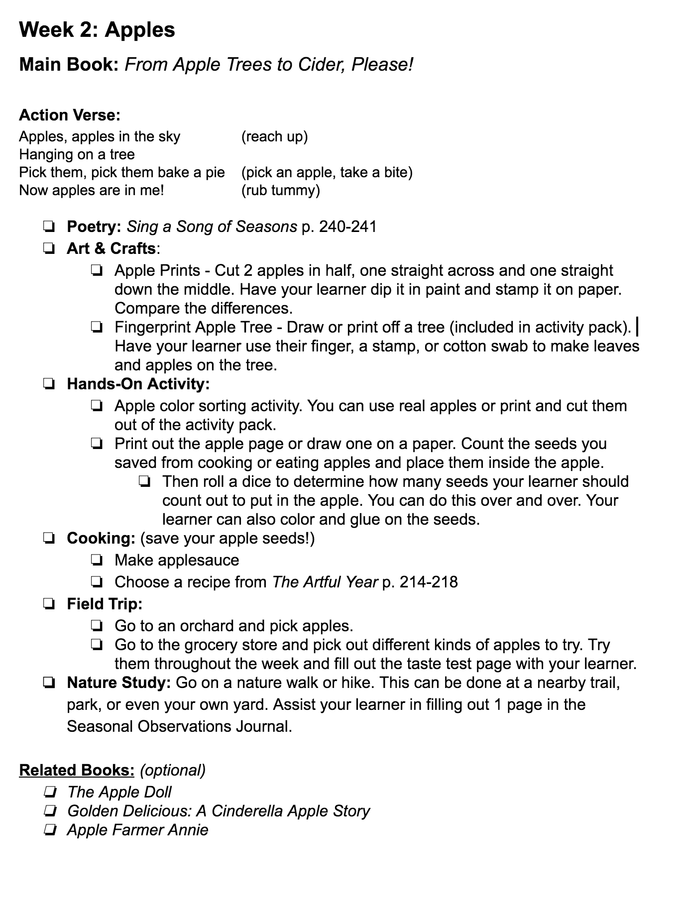 In this curriculum, you get weekly lesson plans, an activity pack, the Seasonal Observations Journal, visual homeschool schedule cards, and a calendar time printable.