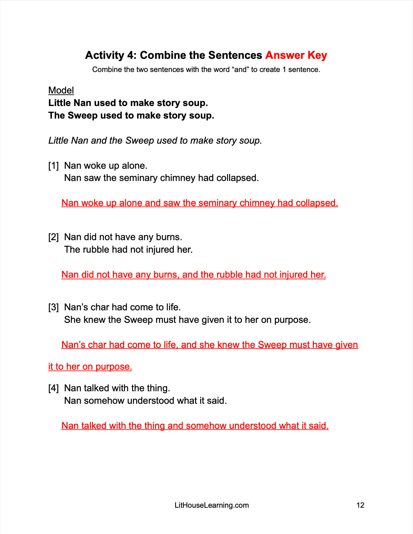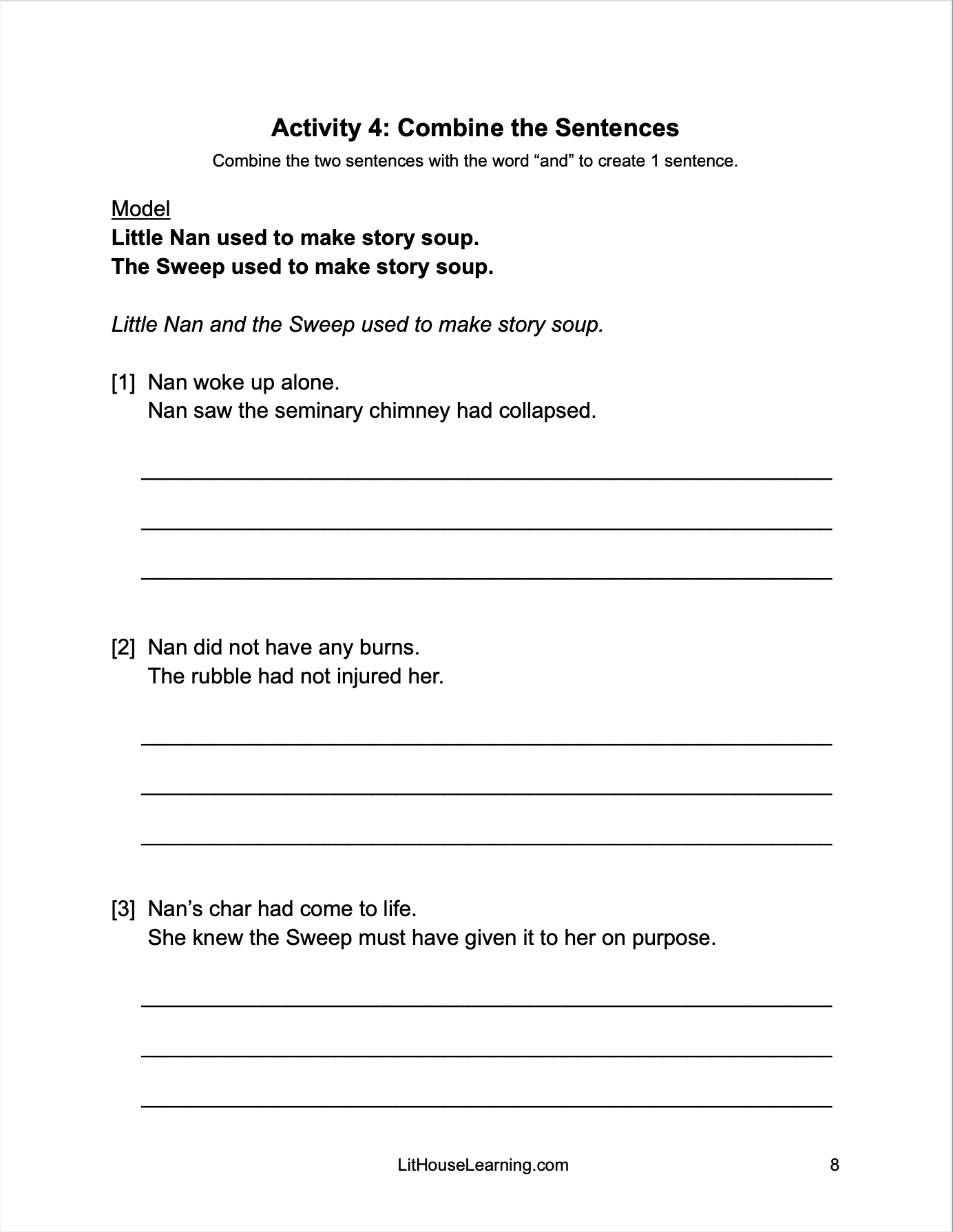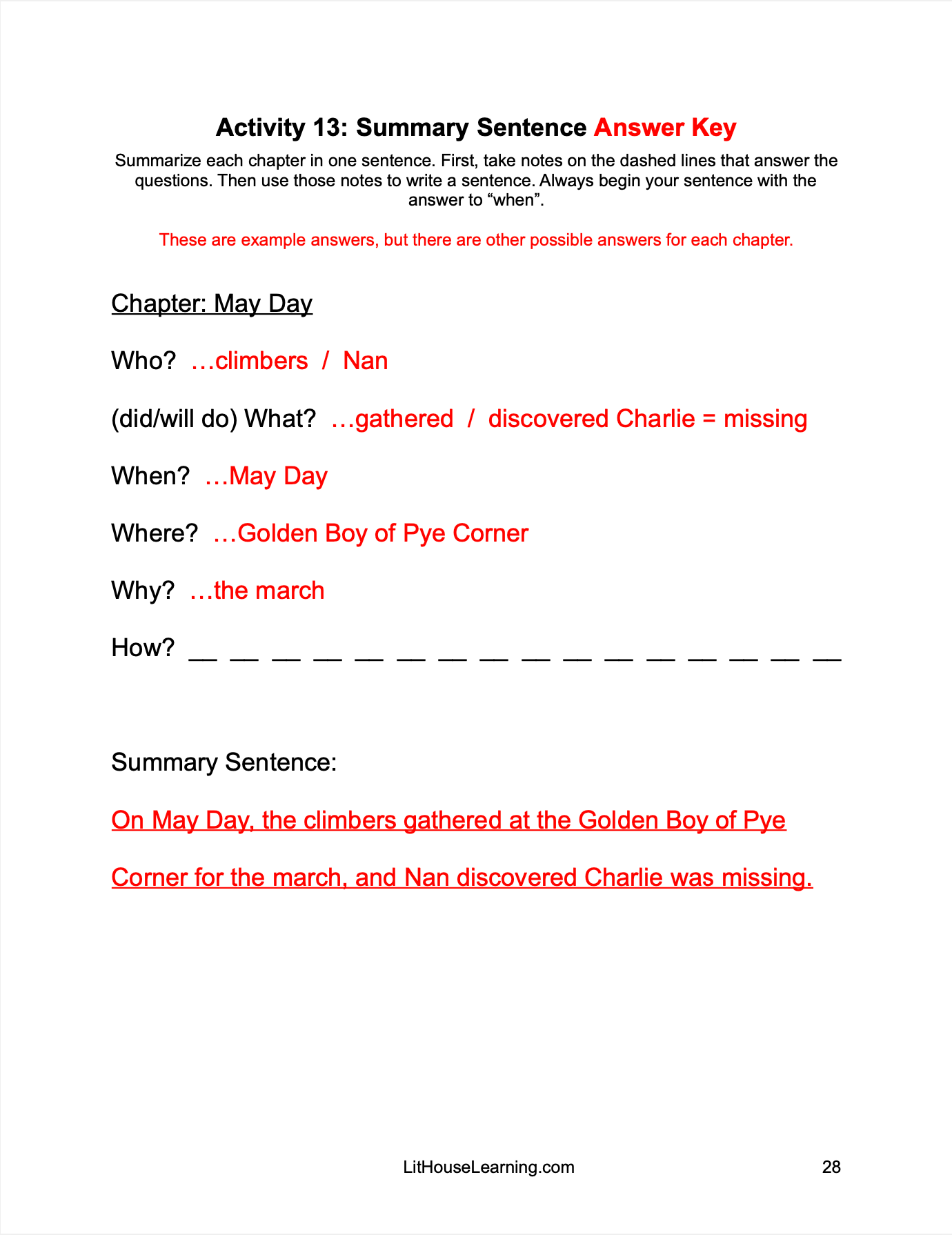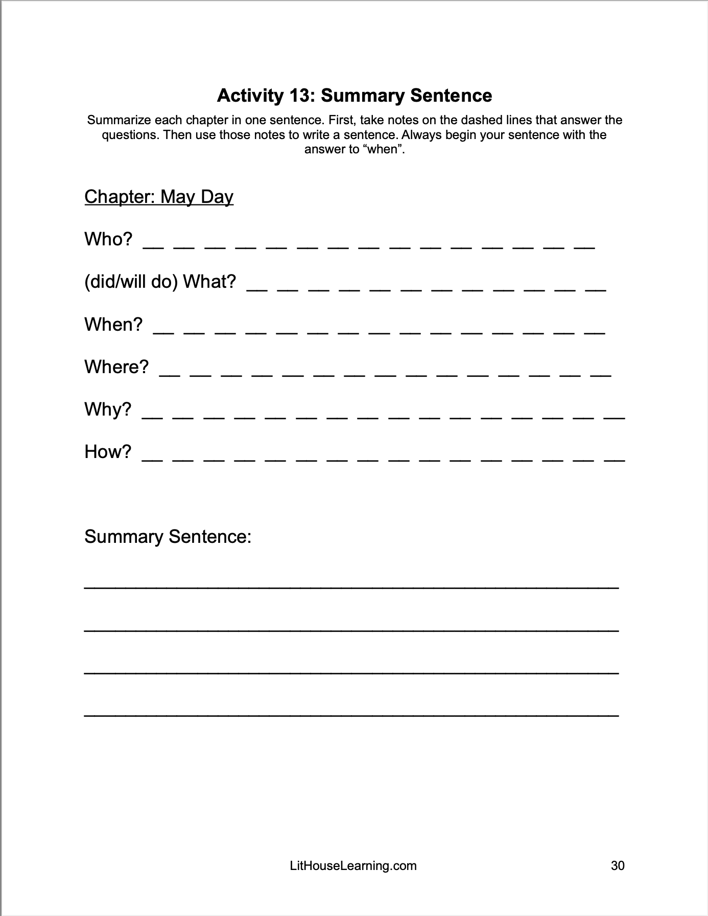 For 14 days, your learner will read, take notes, complete sentence-level writing activities, and study vocabulary. On day 15, you will discuss the plot and the note-taking project with your learner to gain a big-picture understanding of the novel. On day 16 you can have a themed book club with further discussion questions, snacks, and activities. Scroll down to see example pages.