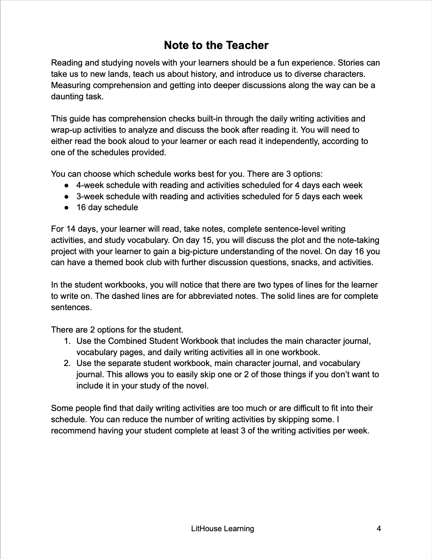 This novel study can be done with three possible schedules: 4 weeks, 3 weeks, or 16 days.
