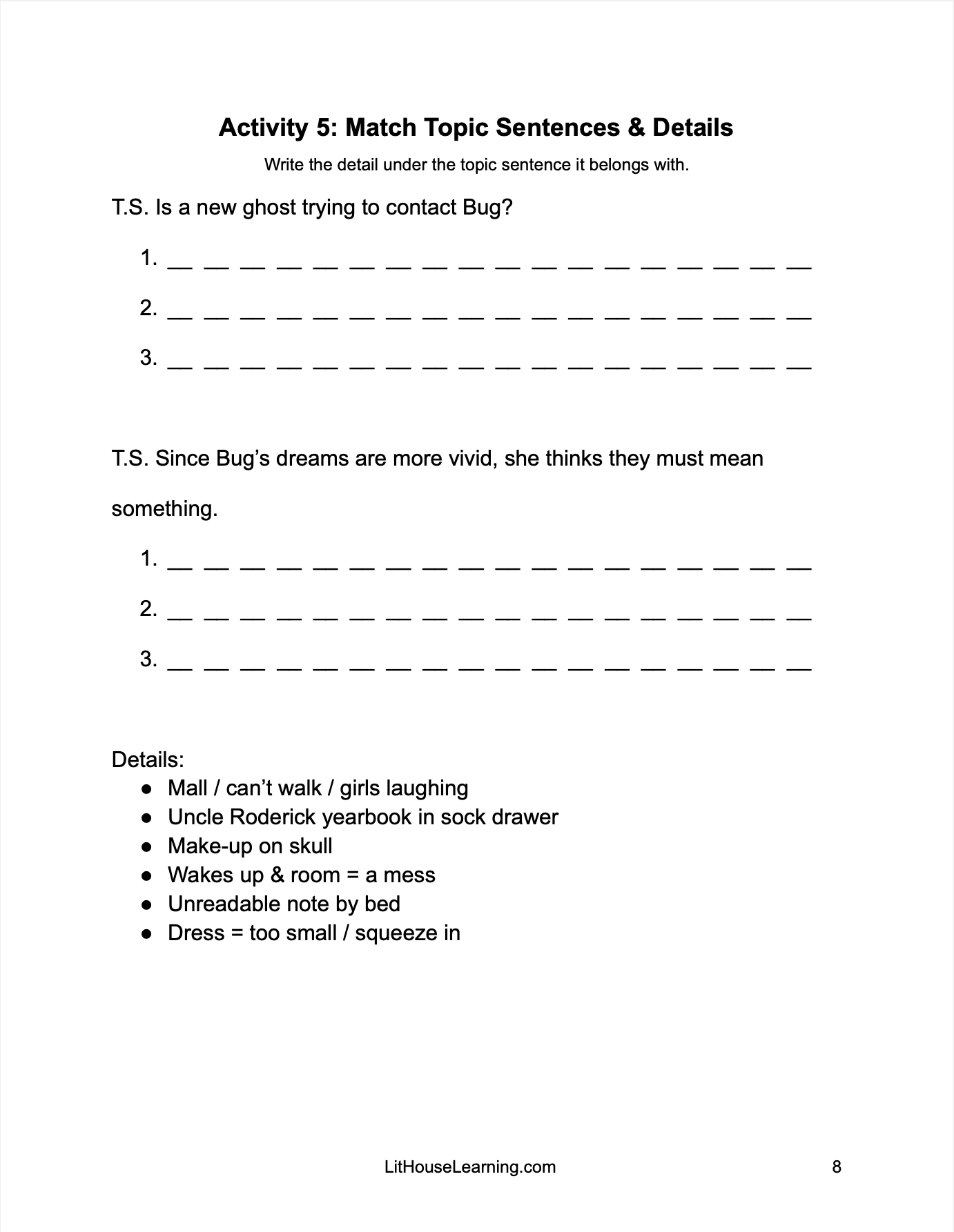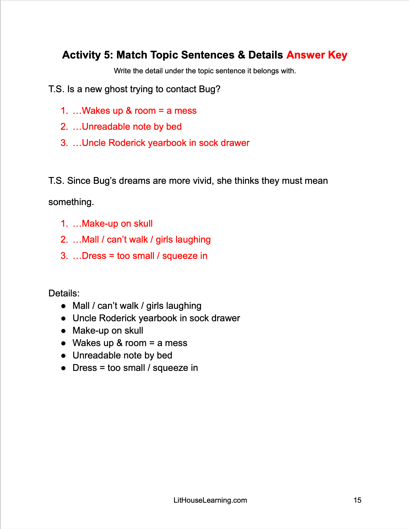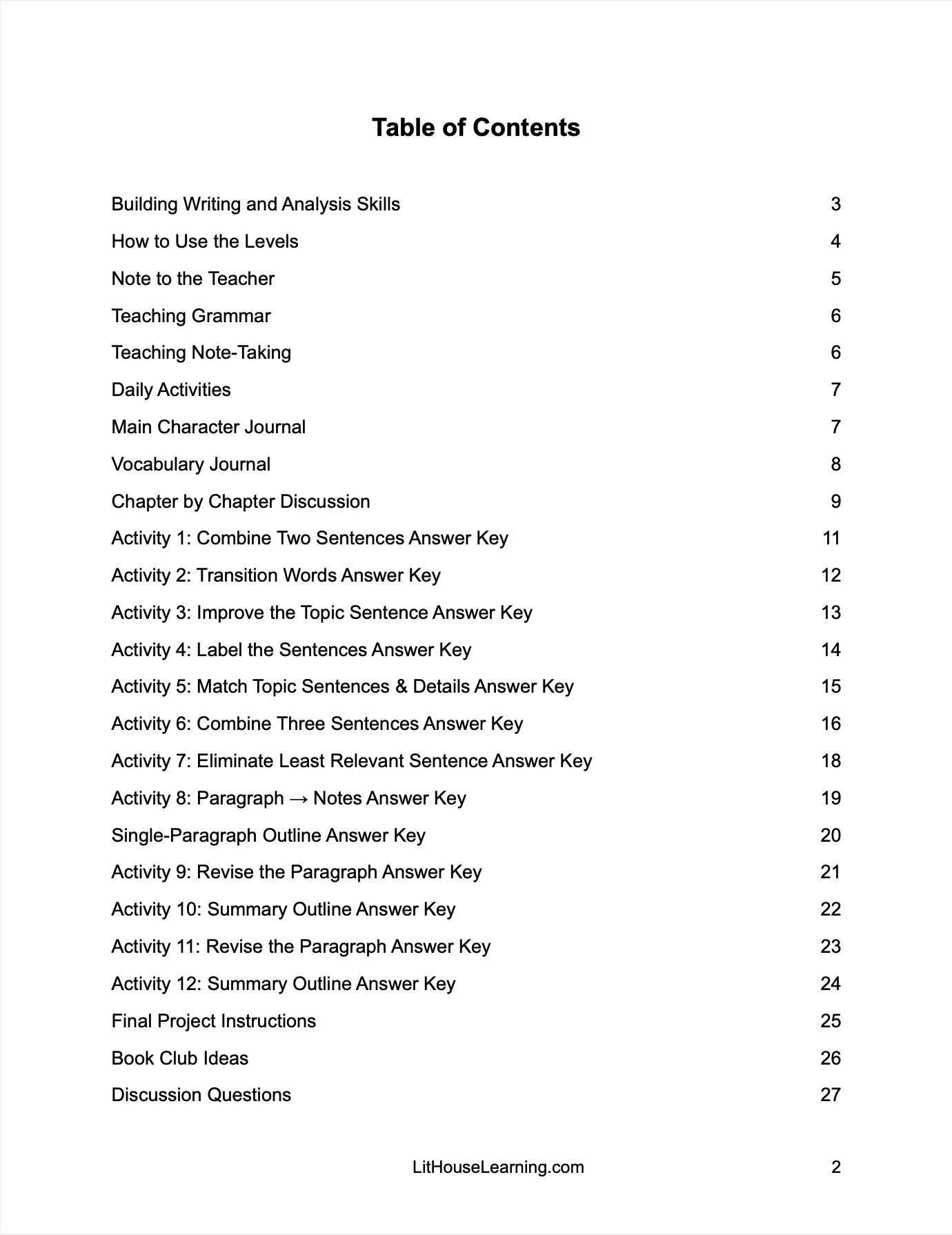 This can be a 4-week, 3-week, or 15-day novel study that includes paragraph-level writing activities, discussion prompts for each chapter, a guided note-taking project, a vocabulary journal, and ideas for a book club with further discussion questions about the whole novel.