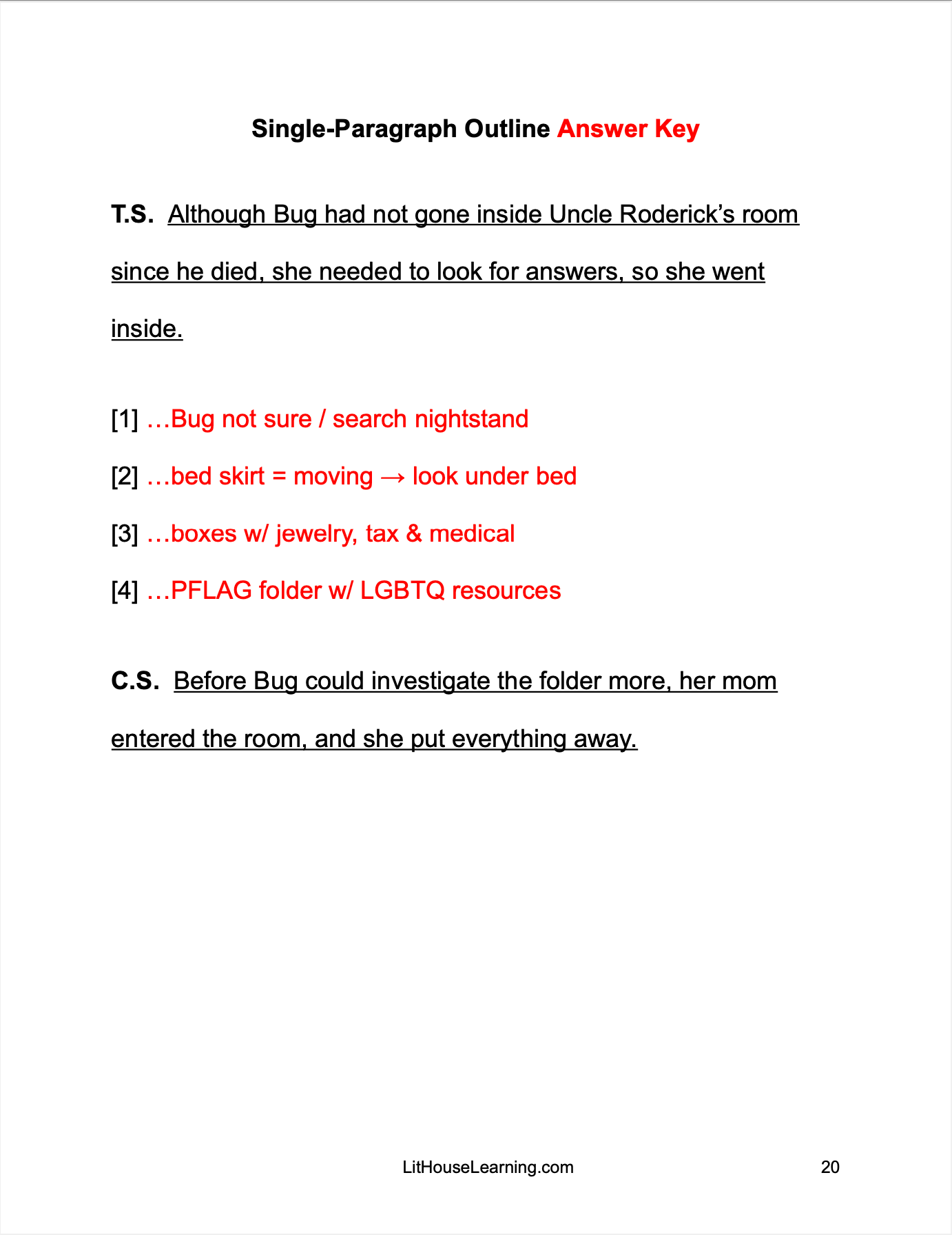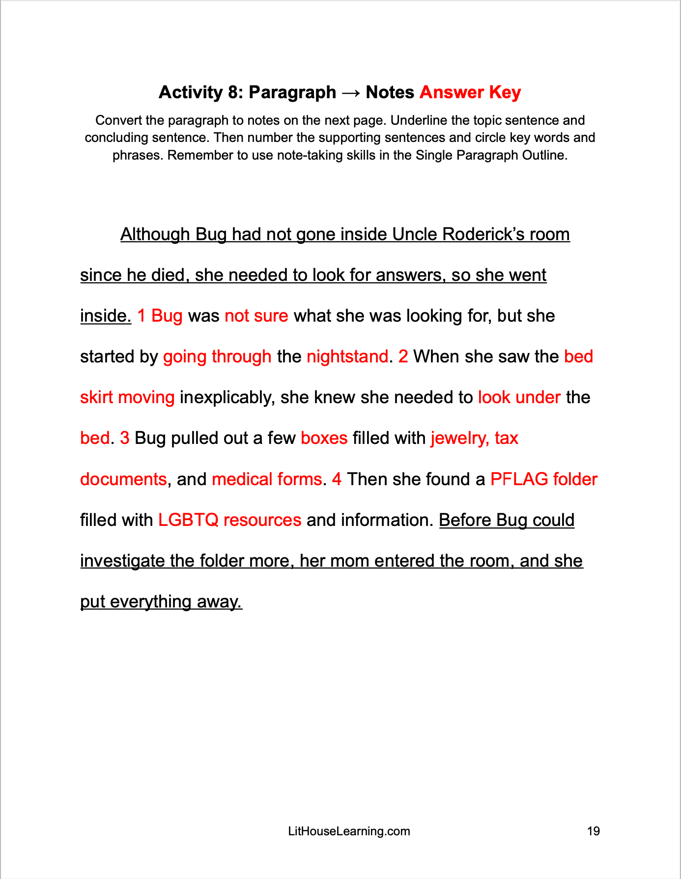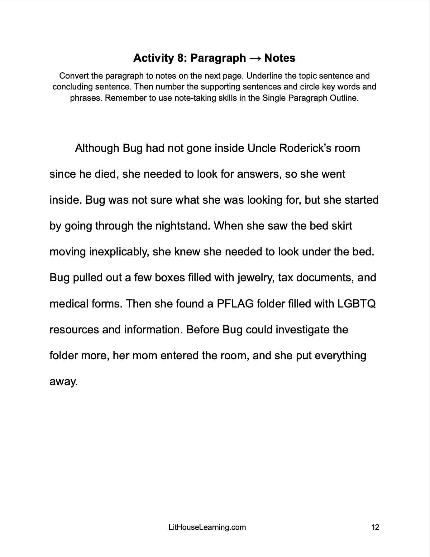 For 12 days, your learner will read, take notes, complete sentence and paragraph-level writing activities, and study vocabulary. On day 13, your student will select the prompt for their final project paragraph and brainstorm details for it. On day 14, you will discuss the note-taking project with your learner, and they will also outline and draft a paragraph. On day 15, they will revise and edit their paragraph to produce a polished final draft. On day 16, you can have a themed book club with further discussion questions, snacks, and activities.