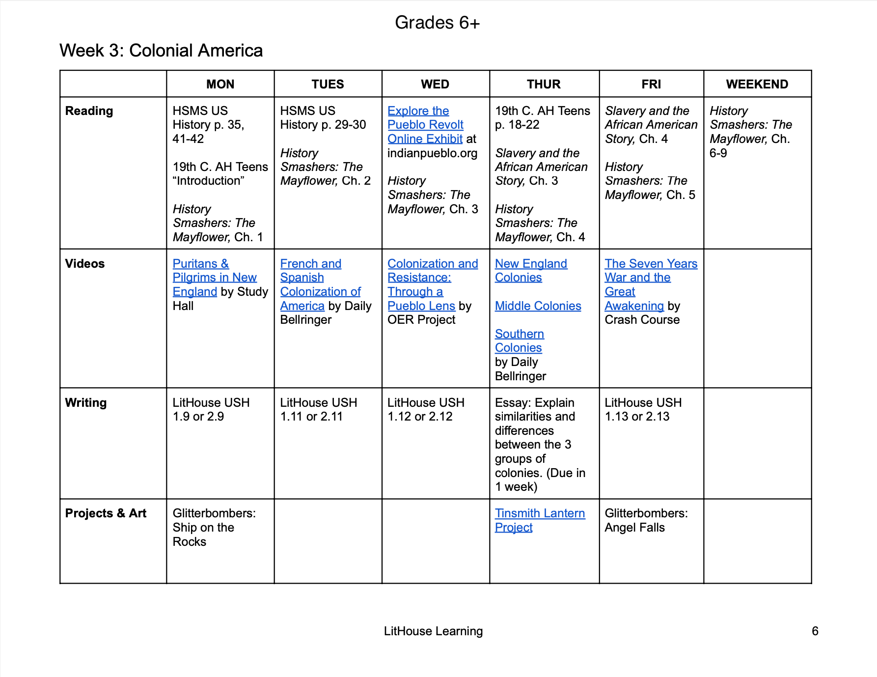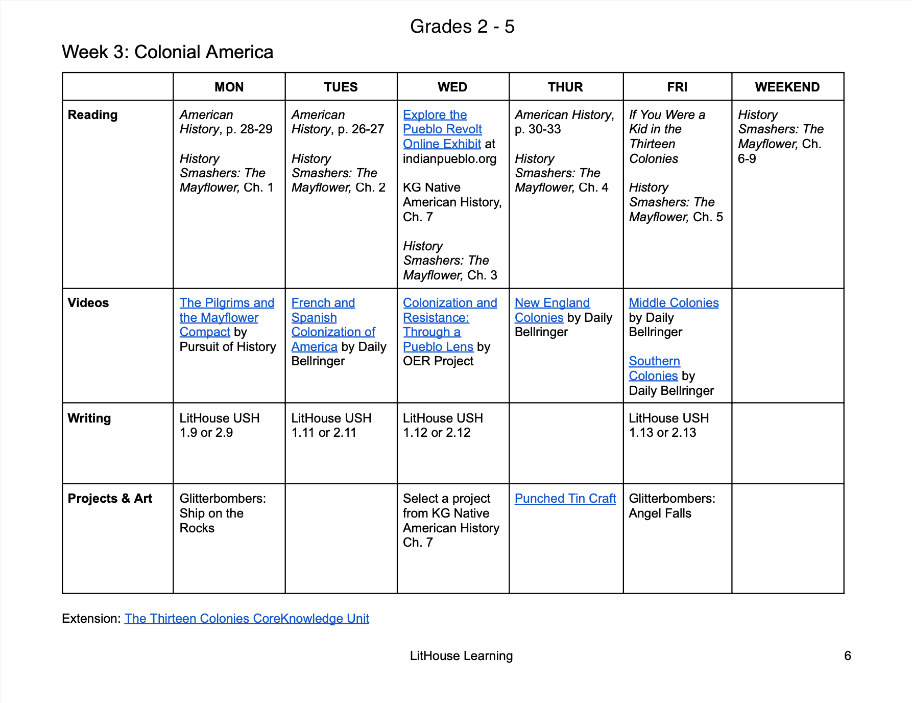 In the weekly schedule, you’ll find reading assignments, videos to watch, writing activities, and hands-on projects. Both the 2-5 Plans and the 6+ plans are included! They follow the same outline but have differentiated reading and videos.